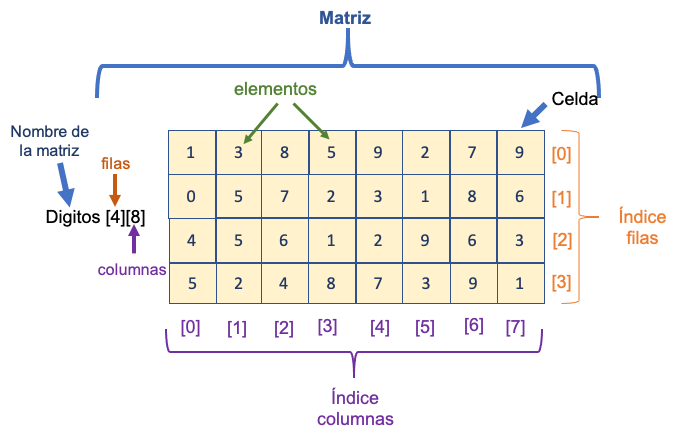 - Elementos. Cada uno de las datos almacenados que componen el arreglo bidimensional.