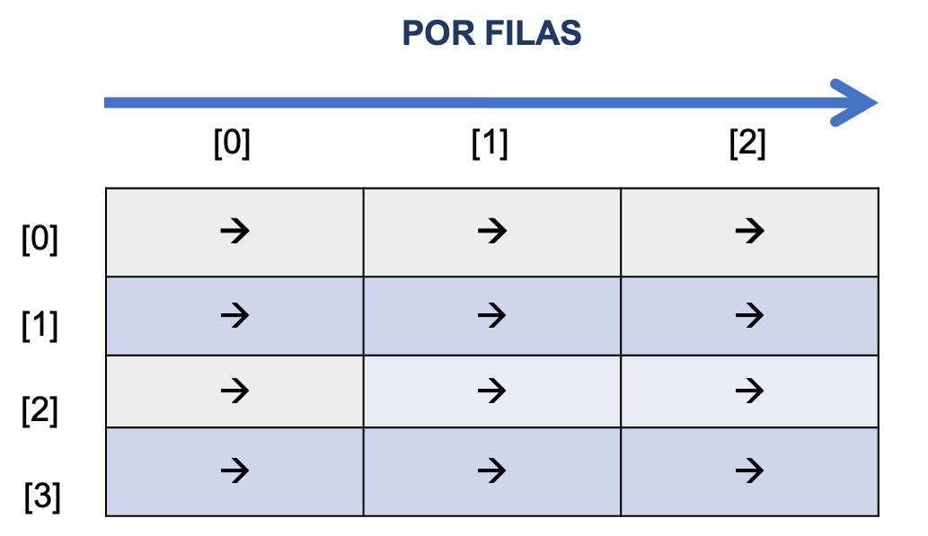 En un arreglo bidimensional, cada elemento tiene una posición que se identifica mediante dos índices: el de su fila y el de su columna.