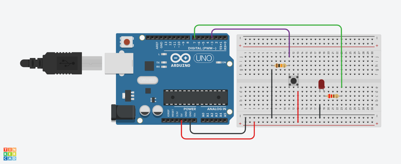 Se desea programar un circuito electrónico que encienda un LED cuando un botón sea presionado y en caso contrario, permanezca apagado. El LED se conectará al pin 7 y el botón al pin 3 (Figura 2).