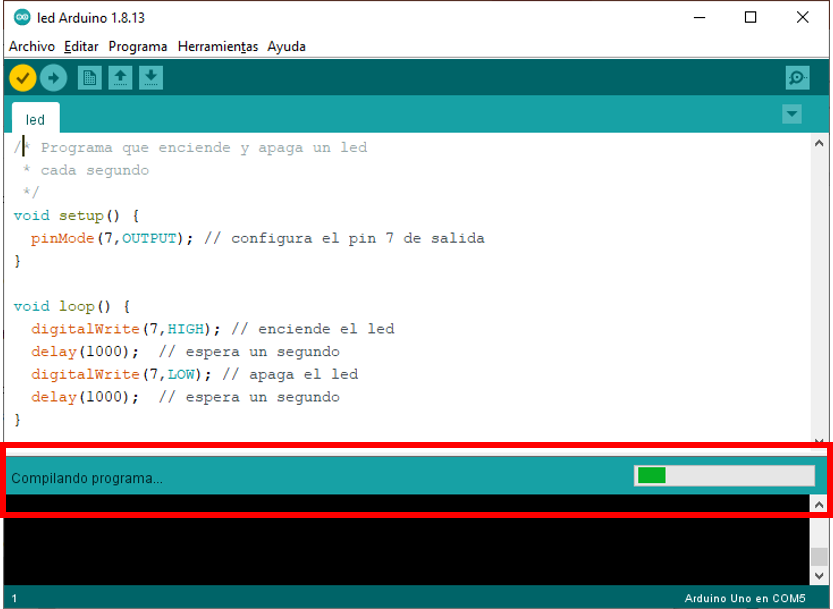 A partir del momento en que se concluye la carga del sketch a la tarjeta Arduino, el programa comienza a ejecutarse. Recuerda que primero se ejecutan las instrucciones de la función setup una única vez y después se ejecutan las instrucciones de la función loop y se repiten indefinidamente.
