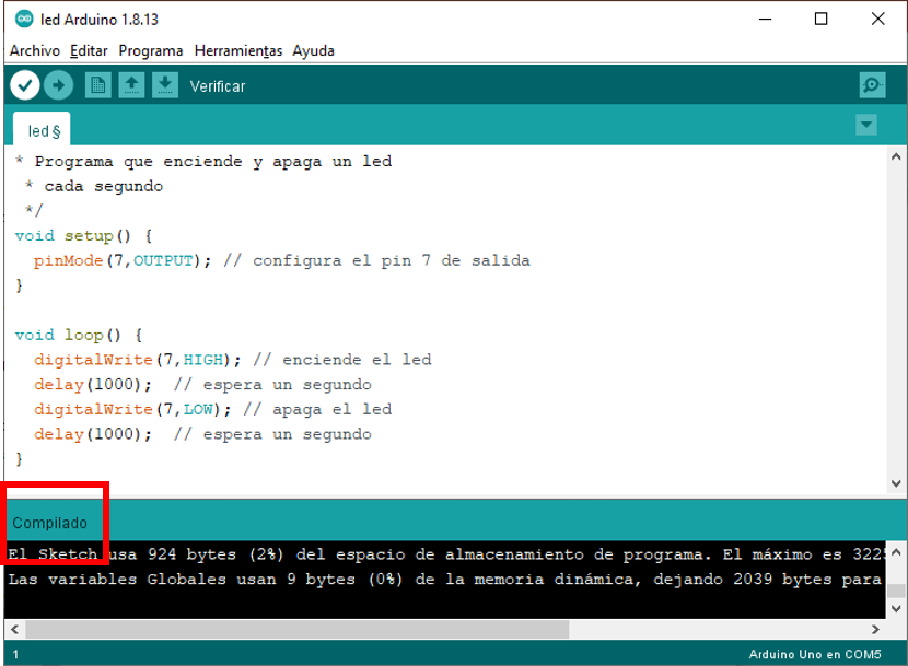 Si el programa no tiene errores, el mensaje Compilado se mostrará en la parte inferior de la pantalla. Si el compilador llegara a detectar algún error en el código, el IDE mostrará los mensajes de error en la parte inferior de la pantalla (Figura 3).