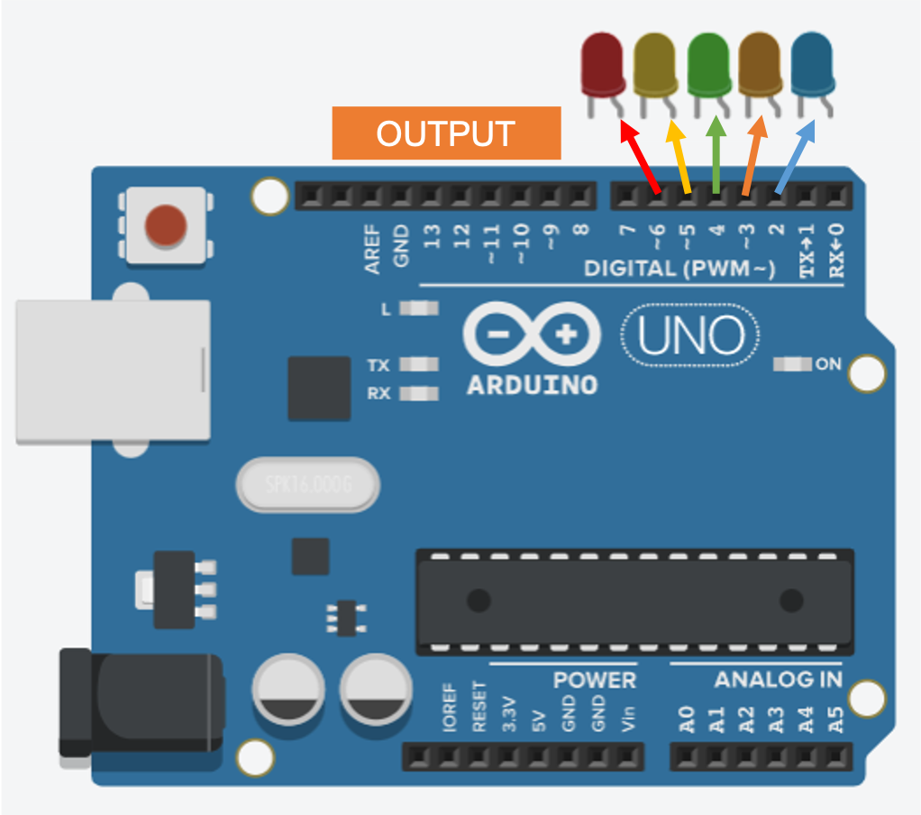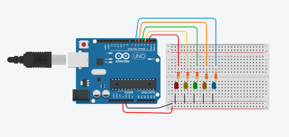 En este circuito, la tarjeta Arduino enviará el valor HIGH (1) a cada uno de los leds que se encuentran conectados, por lo que debemos configurar como salida cada pin, desde el pin 2 al 6. La instrucción de configuración de los pines en la función setup del programa utilizando la sentencia for sería: